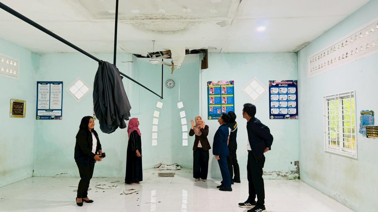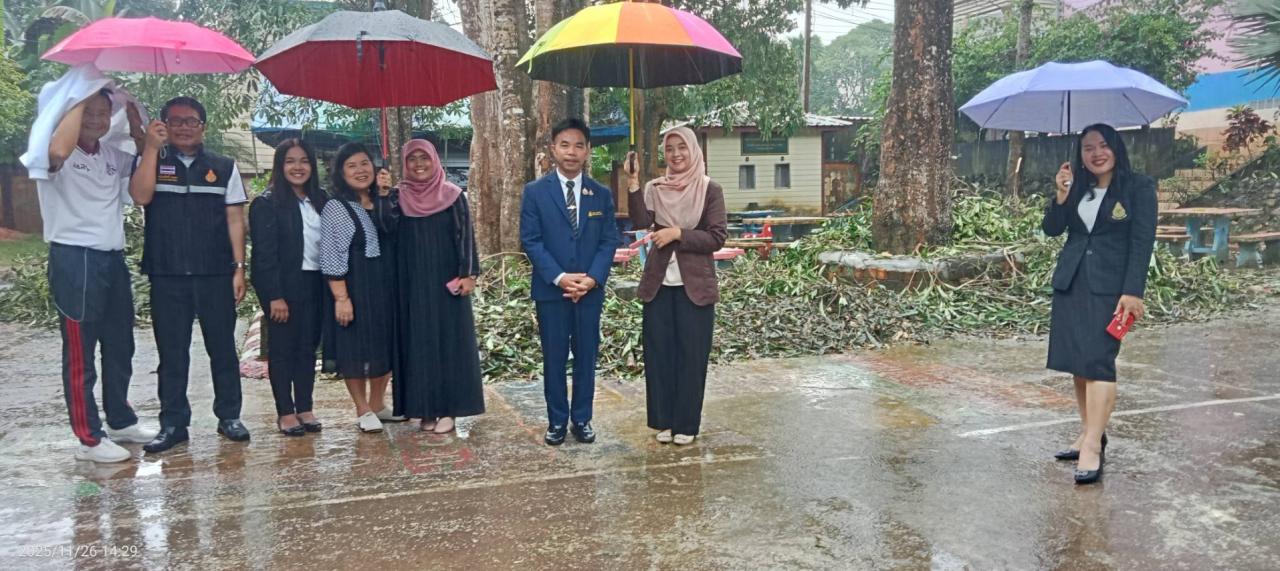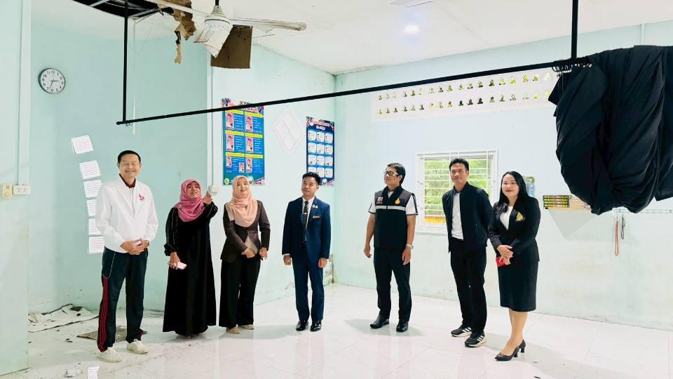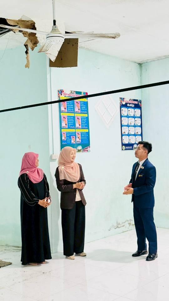 วันที่ 26 พฤศจิกายน 2568 นางฮายาตี มามะ ผู้อำนวยการโรงเรียนบ้านตะบิงติงงี พร้อมด้วย นางสาวนูรฟาฏีมะฮ์ สะดียามู รองผู้อำนวยการโรงเรียนบ้านตะบิงติงงี ให้การต้อนรับ นายลิขิต ศรีวรมย์ ผู้อำนวยการสำนักงานเขตพื้นที่การศึกษาประถมศึกษายะลา เขต 2 พร้อมด้วย ดร.วาทยุทธ พุทธพรหม , ดร.สุรศักดิ์ เจตนา , นายวีรพันธ์ สานนท์ , นางสาวมลฤดี คำผุย รองผู้อำนวยการ สพป.ยะลา เขต 2 นางพิศมัย ศรีวรมย์ ศึกษานิเทศก์ชำนาญการพิเศษ และคณะจาก สพป.ยะลา เขต 2 ได้ลงพื้นที่ติดตามสถานการณ์อุทกภัย ณ โรงเรียนบ้านตะบิงติงงี หลังเกิดฝนตกหนักต่อเนื่องหลายวัน ส่งผลให้หลังคาอาคารเรียน อาคารละหมาด เกิดการรั่วซึม น้ำไหลลงเพดานและทำให้เพดานบางส่วนร่วงหล่น โดยได้ตรวจเยี่ยม สำรวจความเสียหายจริงในพื้นที่ พร้อมรับฟังรายงานสถานการณ์จากคณะครู และหารือแนวทางในการเฝ้าระวัง แก้ไข และวางแผนซ่อมแซมเพื่อให้สามารถจัดการเรียนการสอนได้อย่างปลอดภัยต่อไป