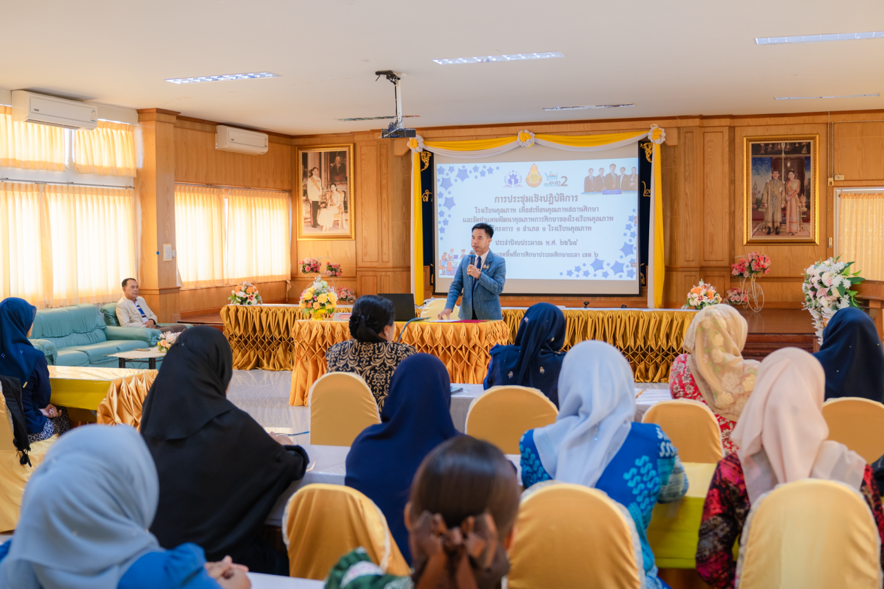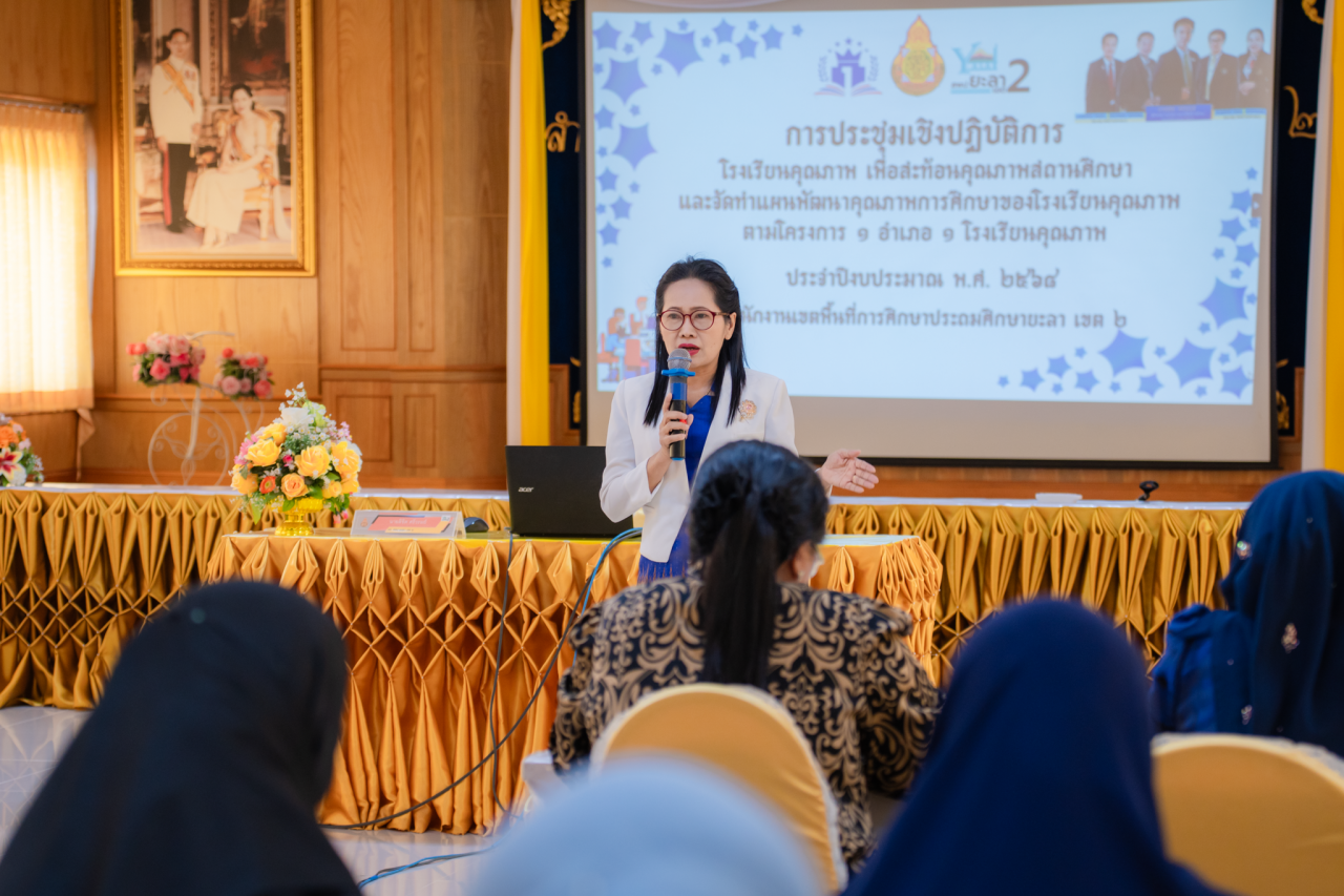 วันที่ 12 กันยายน 2568 นายลิขิต ศรีวรมย์ ผู้อำนวยการ สพป.ยะลา 2 เป็นประธานในพิธีเปิดการประชุมเชิงปฏิบัติการ การสะท้อนคุณภาพสถานศึกษา ภายใต้โครงการ 1 อำเภอ 1 โรงเรียนคุณภาพ ประจำปีงบประมาณ พ.ศ. 2568 ณ ห้องประชุมอดินันท์ ปากบารา สพป.ยะลา เขต 2 อำเภอบันนังสตา จังหวัดยะลา โดยมี ดร.วาทยุทธ พุทธพรม รองผู้อำนวยการ สพป.ยะลา เขต 2 กล่าวรายงานวัตถุประสงค์ของการจัดประชุม