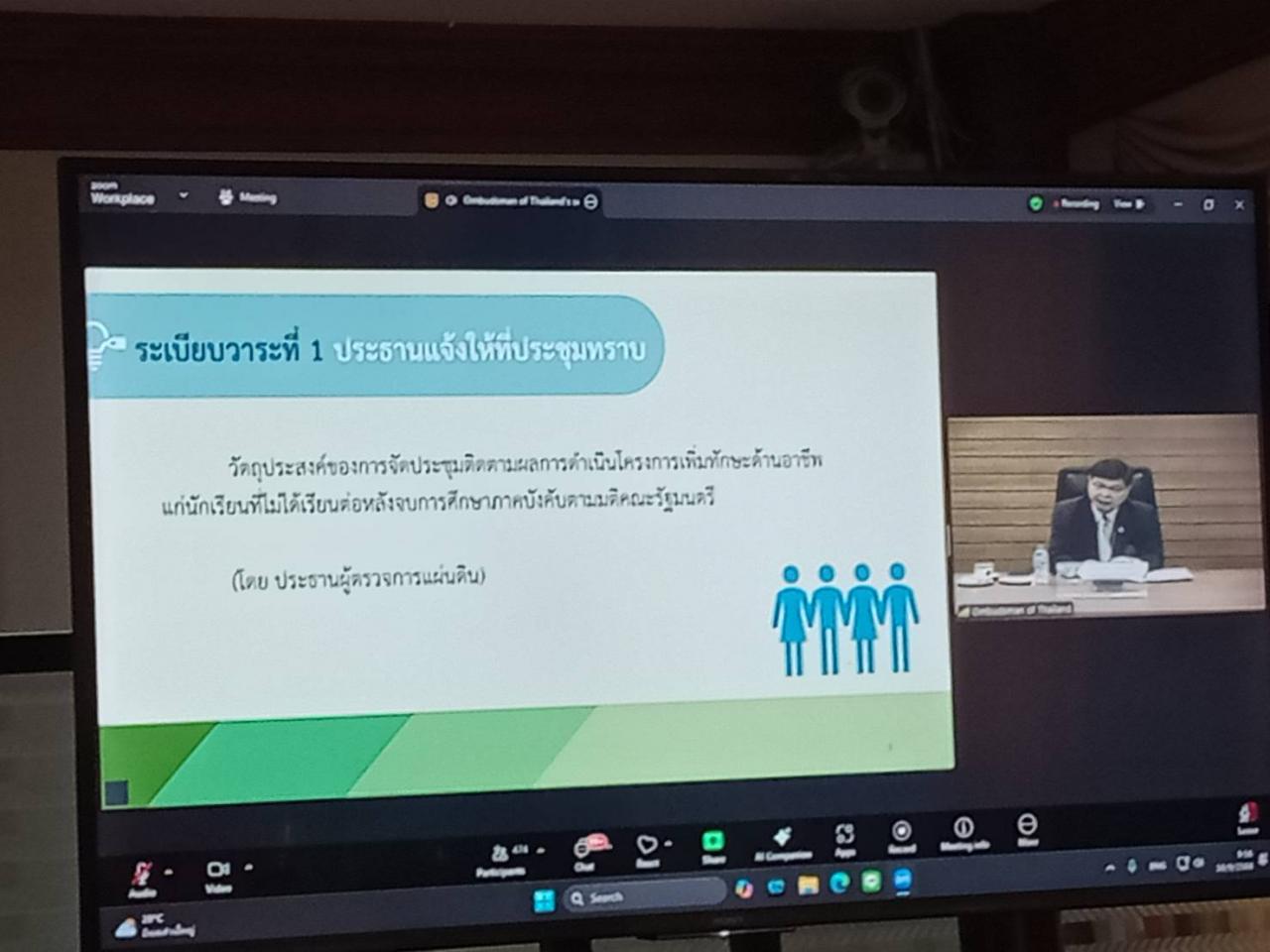 การประชุมจัดโดย สำนักงานผู้ตรวจการแผ่นดิน ผ่านระบบออนไลน์ (Zoom Meeting) เพื่อติดตามการดำเนินโครงการเพิ่มทักษะด้านอาชีพแก่นักเรียนที่ไม่ได้เรียนต่อหลังจบการศึกษาภาคบังคับ ตามมติคณะรัฐมนตรี พร้อมทั้งรับฟังปัญหา อุปสรรค และข้อเสนอแนะจากหน่วยงานที่เกี่ยวข้อง เพื่อพัฒนากระบวนการเพิ่มทักษะอาชีพให้เกิดประสิทธิผลและตอบโจทย์ความต้องการของนักเรียนกลุ่มเป้าหมาย