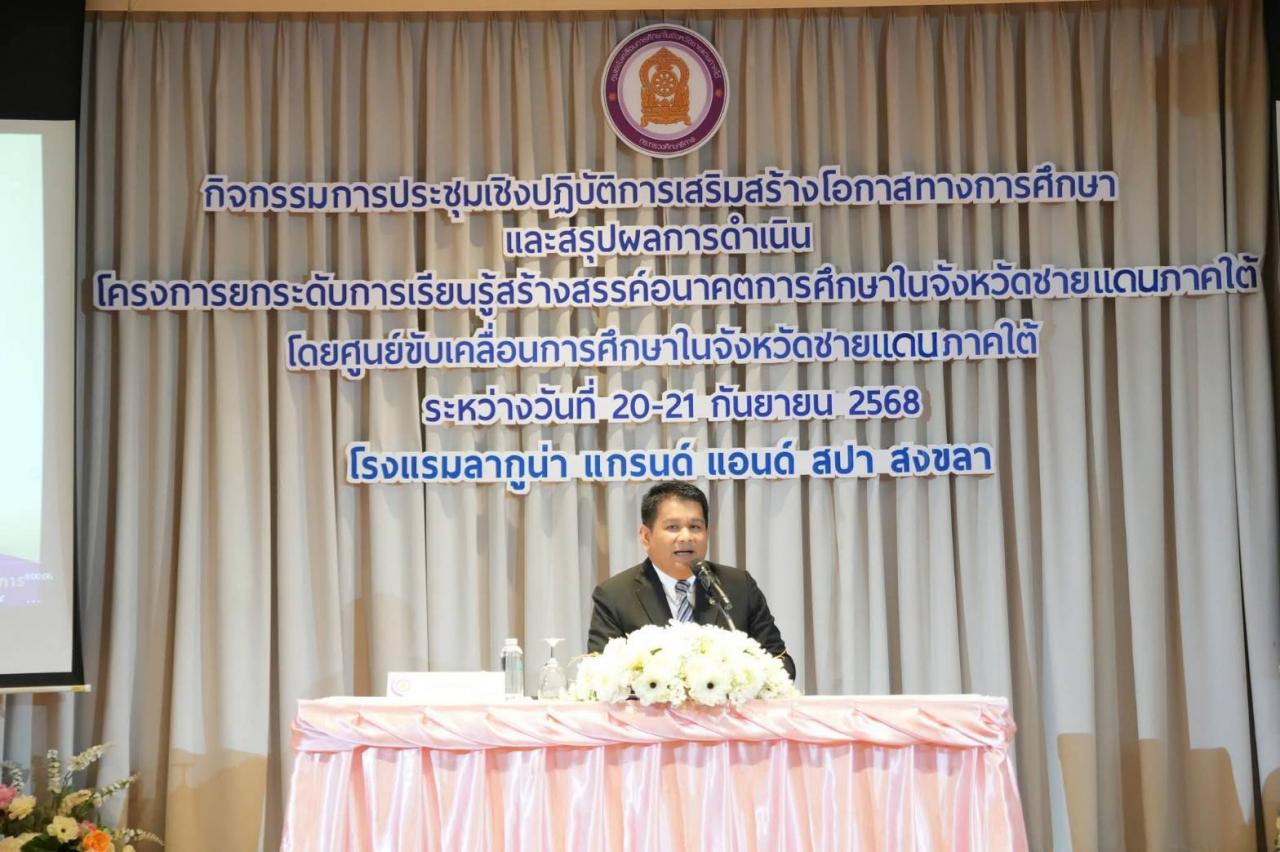 วันที่ 20 - 21 กันยายน 2568 นายลิขิต ศรีวรมย์ ผู้อำนวยการ สพป.ยะลา เขต 2 มอบหมายให้ นางรอกีเย๊าะ เจ๊ะมะ ศึกษานิเทศก์ชำนาญการพิเศษ พร้อมด้วยนางรอสีเยาะ มะแอ ศึกษานิเทศก์ชำนาญการพิเศษ และนางเฉลียวศาสตร์ นุ้ยสมัน ศึกษานิเทศก์ชำนาญการพิเศษ เข้าร่วมกิจกรรมประชุมเชิงปฏิบัติการเสริมสร้างโอกาสทางการศึกษา และสรุปผลการดำเนินโครงการยกระดับการเรียนรู้สร้างสรรค์อนาคตการศึกษาในจังหวัดชายแดนภาคใต้ ณ ห้องประชุม Laguna Queen Ballroom ชั้น1 โรงแรมลากูนาแกรนด์แอนด์สปาสงขลา อำเภอเมืองสงขลา จังหวัดสงขลา ในการจัดประชุมเชิงปฎิบัติการในครั้งนี้มีนายนิกร เซ้งเถียร ผู้อำนวยการศูนย์ขับเคลื่อนการศึกษาในจังหวัดชายแดนภาคใต้ เป็นประธานในพิธีเปิด