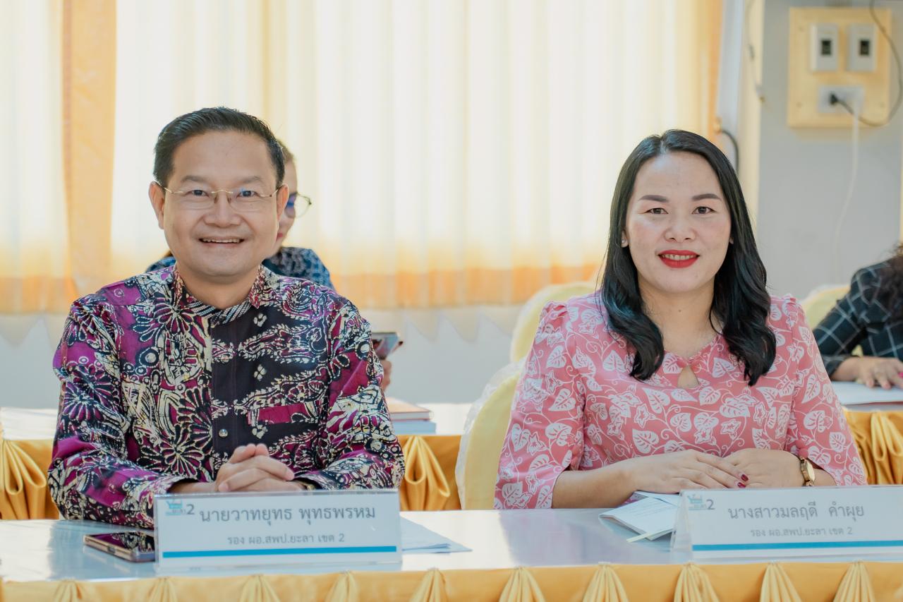 ในการนี้ นายรอมลี มัสกอตอ ผู้แทน กศจ. อนุกรรมการ อ.ก.ค.ศ. เขตพื้นที่การศึกษาประถมศึกษายะลา เขต 2 , นางสาวเสาวภางค์ มโนภักดี ผู้ทรงคุณวุฒิด้านการบริหารการศึกษา คณะกรรมการติดตาม ตรวจสอบ ประเมินผล และนิเทศการศึกษา เขตพื้นที่การศึกษาประถมศึกษายะลา เขต 2 พร้อมด้วย ดร.วาทยุทธ พุทธพรหม นายวีรพันธ์ สานนท์ และนางสาวมลฤดี คำผุย รองผู้อำนวยการ สพป.ยะลา เขต 2 รวมถึงผู้อำนวยการกลุ่ม/หน่วย ศึกษานิเทศก์ และบุคลากรในสังกัด เข้าร่วมประชุม